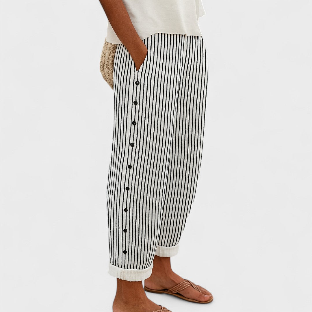 Experience the perfect balance between comfort and elegance. With a classic blue and white striped pattern, decorative side buttons, and a relaxed cut, these pants are ideal for enjoying warm days with ease and sophistication. The soft, breathable fabric guarantees freshness, while the thoughtful details make this garment unique and versatile.