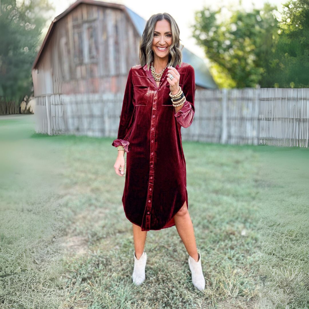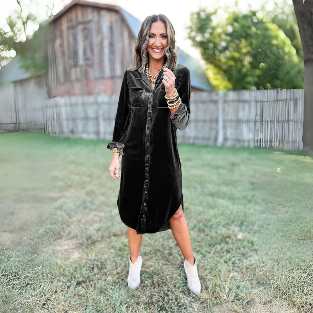 Wrap yourself in effortless elegance with the Camille™ Velour Button-Down Dress. Designed to bring a touch of luxury to your wardrobe, this dress combines timeless sophistication with modern comfort. Whether for a casual day out or a glamorous evening event, its soft velour fabric and stylish button-down front ensure you always stand out. Elevate your look with a piece that’s as versatile as it is chic.Effortless Elegance in Velvet