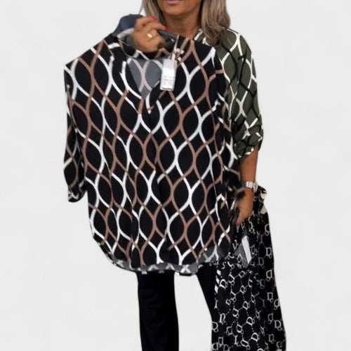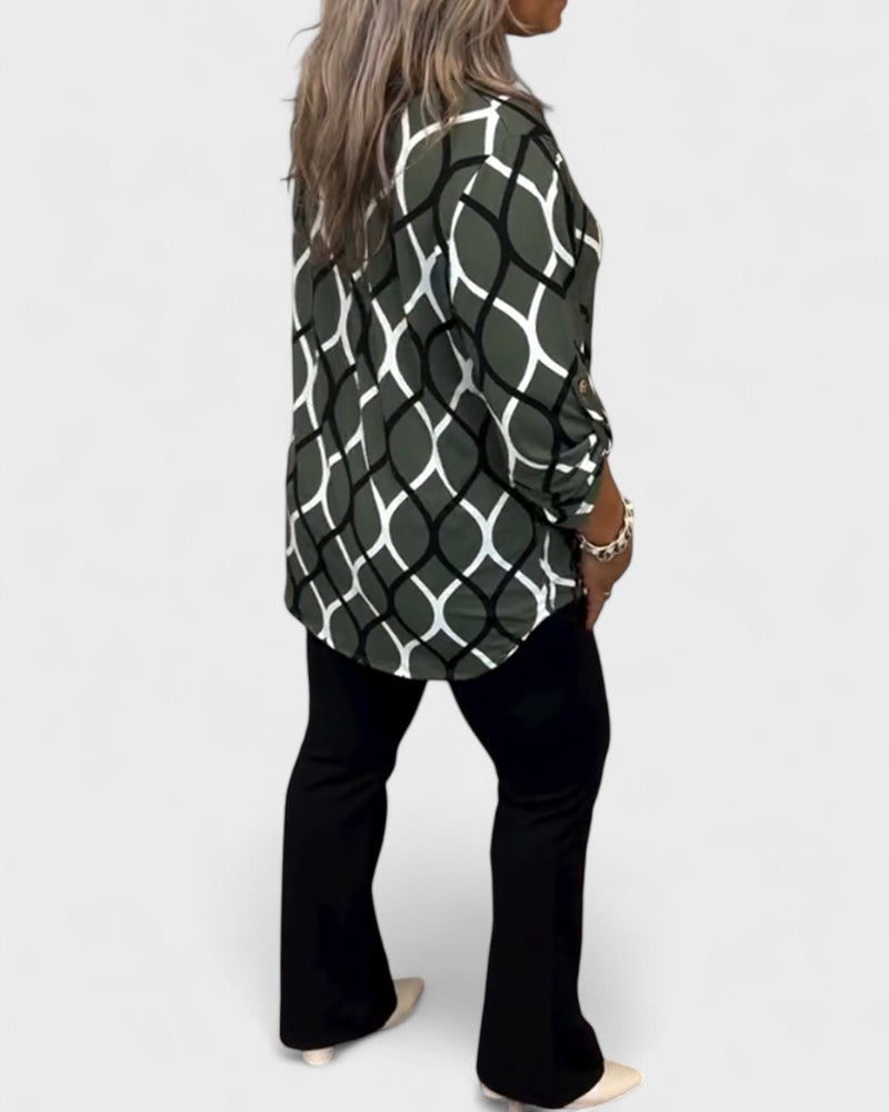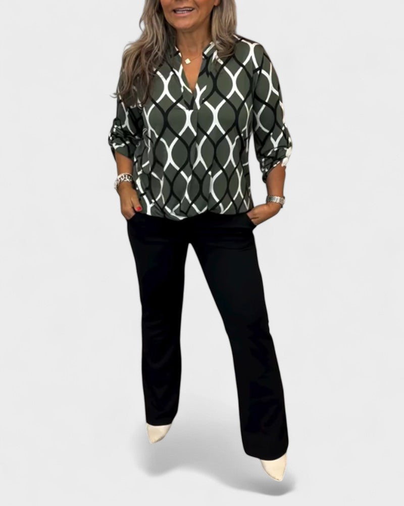 With a striking graphic pattern and a fluid cut, this shirt is the key to elevating any look. It is perfect for both casual and professional occasions, offering an ideal balance between style and comfort. The lightweight fabric and V-neck design accentuate the silhouette, while the adjustable sleeves make the look more versatile and practical.