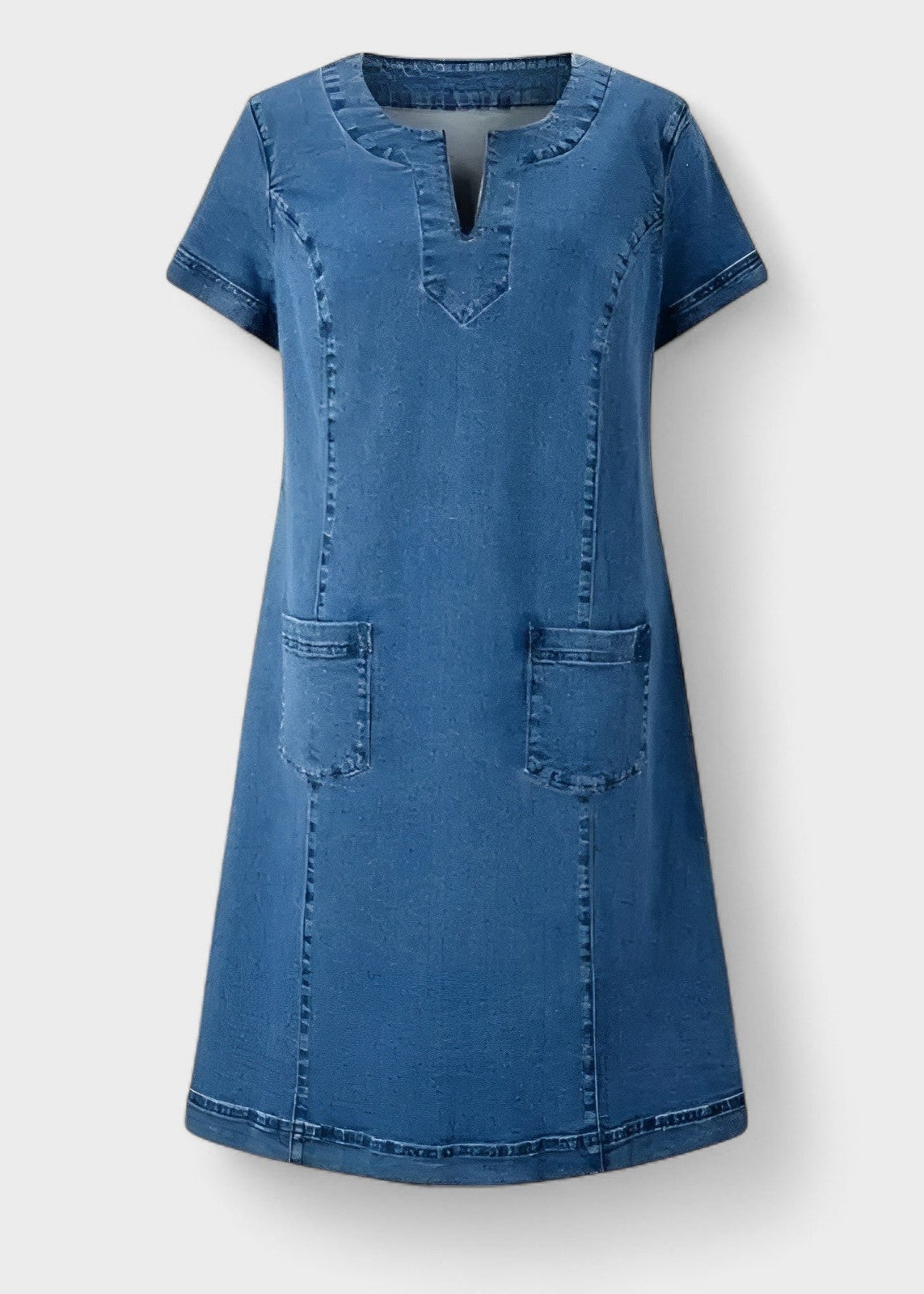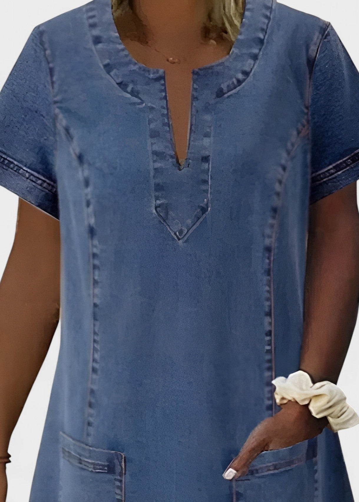 Refresh your wardrobe with this relaxed denim dress that combines functionality and charm. It features a straight cut that flatters all body types, functional front pockets, short sleeves, and a modern V-neckline with slit details. This dress is ideal for everyday wear or casual outings and is the perfect choice for those who want comfort without compromising on style.