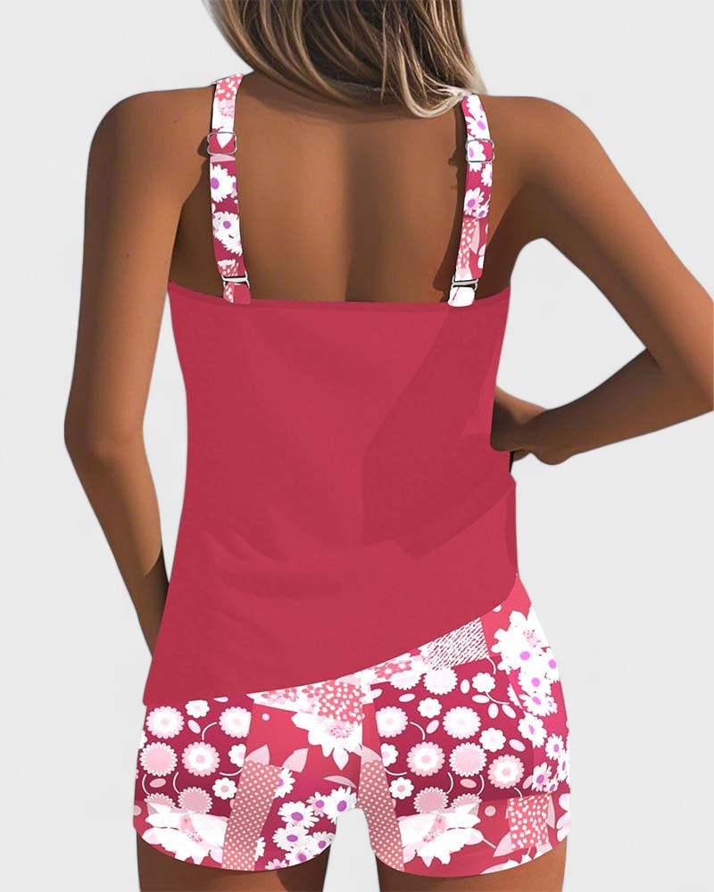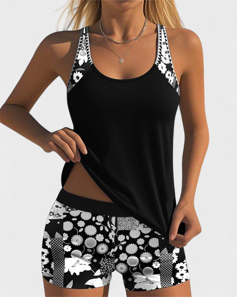 This women's swimwear set combines comfort, modern design, and total freedom of movement. It consists of a sporty top with wide straps and shorts with an elastic waistband, making it ideal for those seeking a practical, youthful, and versatile look for days at the beach, by the pool, or for water activities. The floral details add a fresh, feminine touch to the outfit.