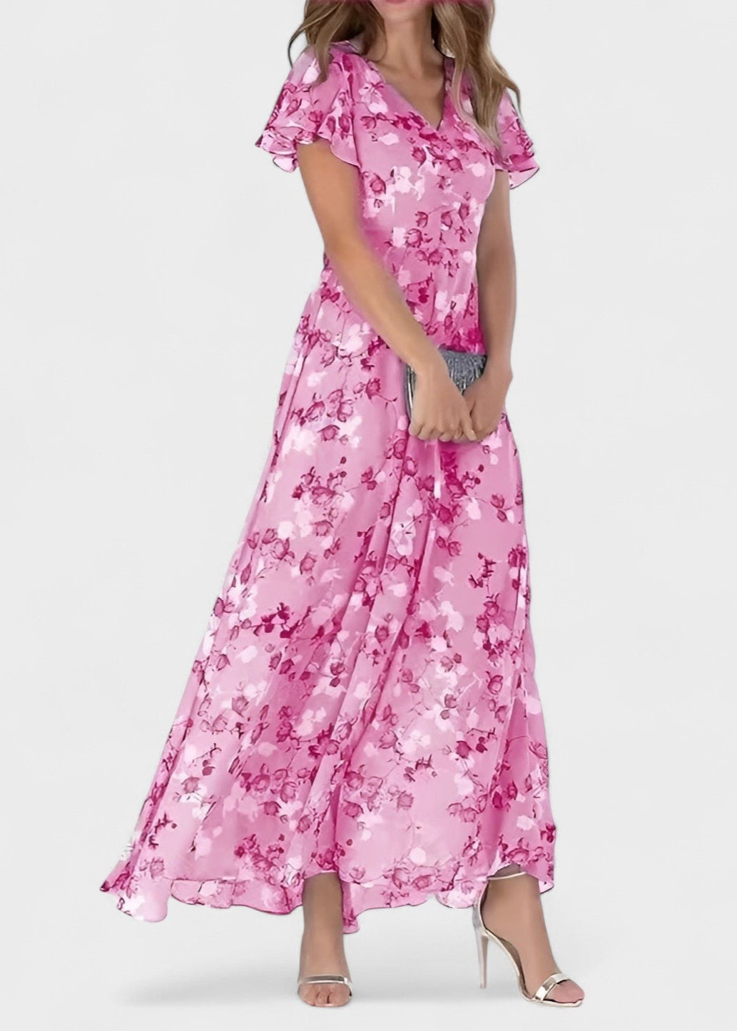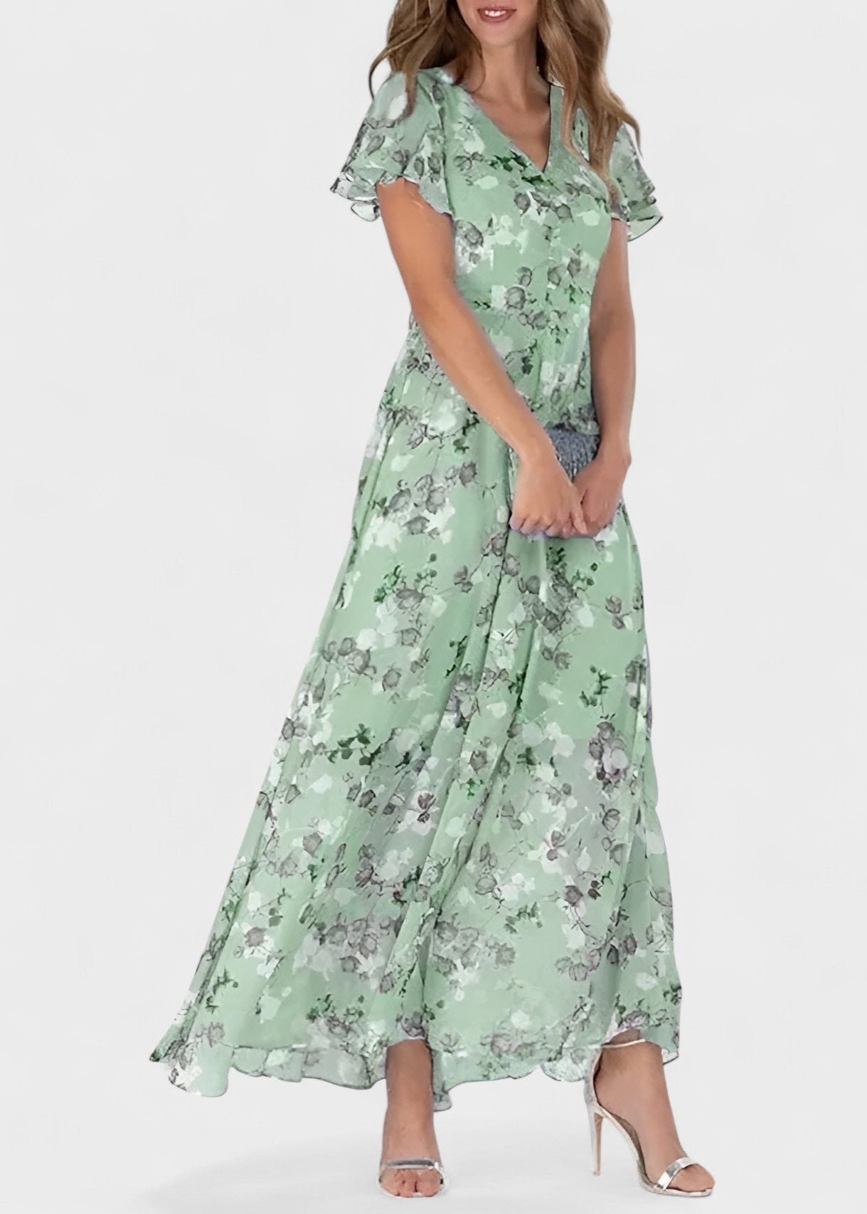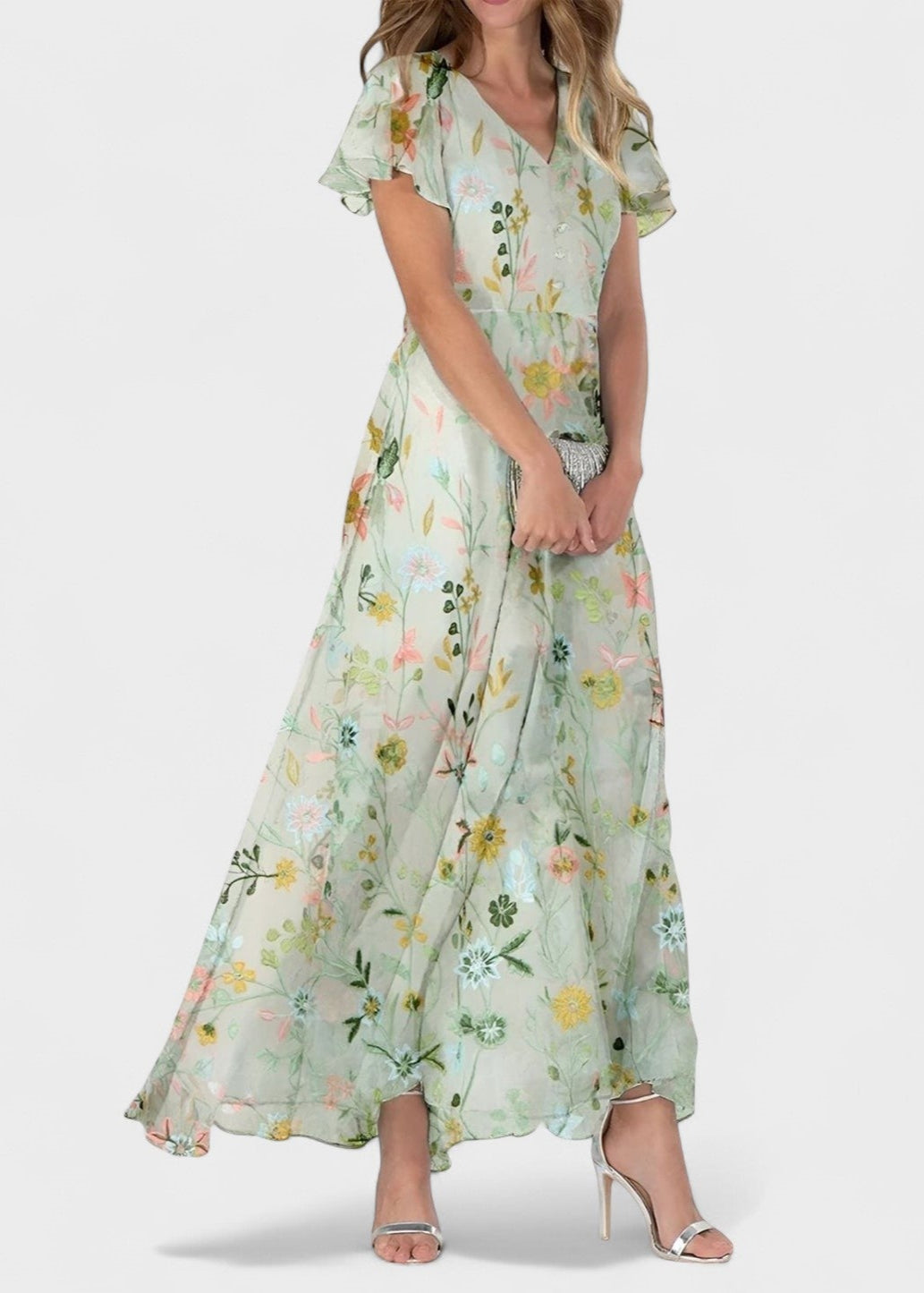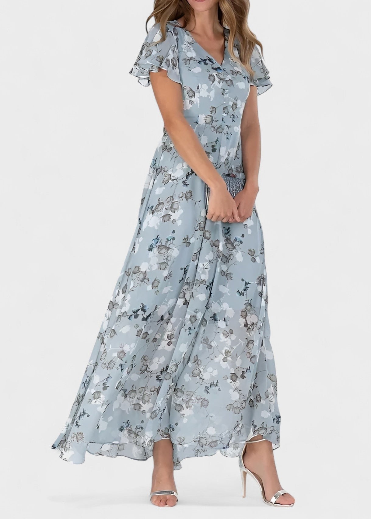This long dress with a floral print and fluttery sleeves is the perfect choice for special occasions with a touch of romance. The flowing cut and delicate neckline accentuate the silhouette with ease and refinement, creating a feminine, fresh, and elegant look. Ideal for weddings, dinners, or outdoor parties.