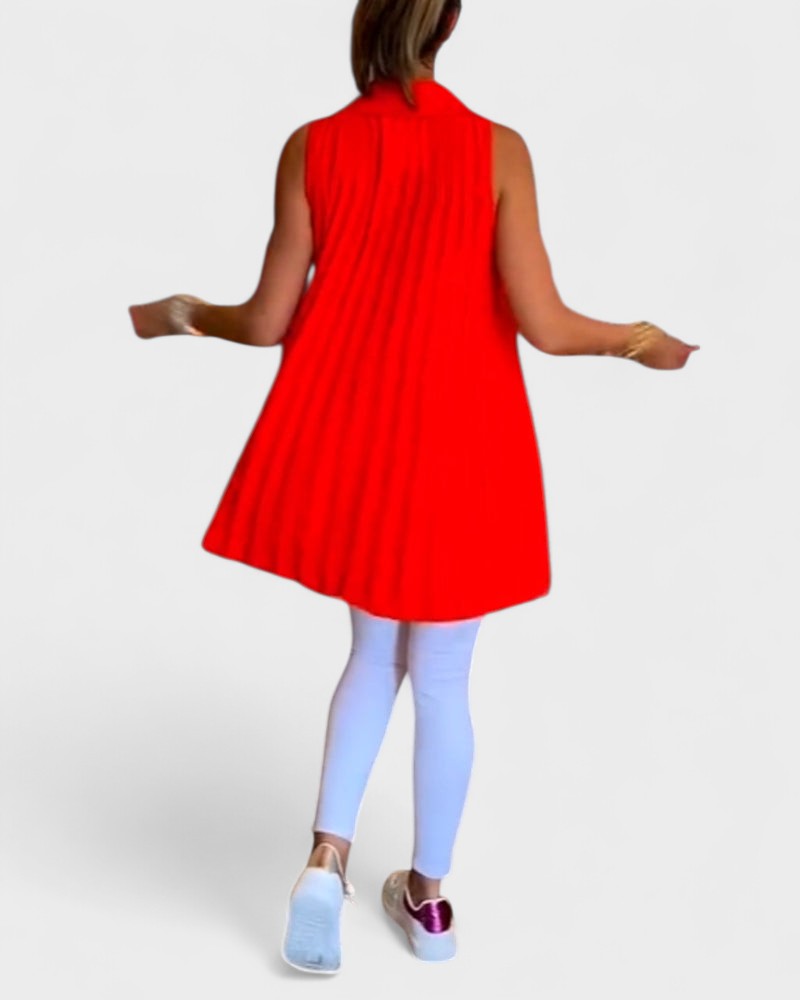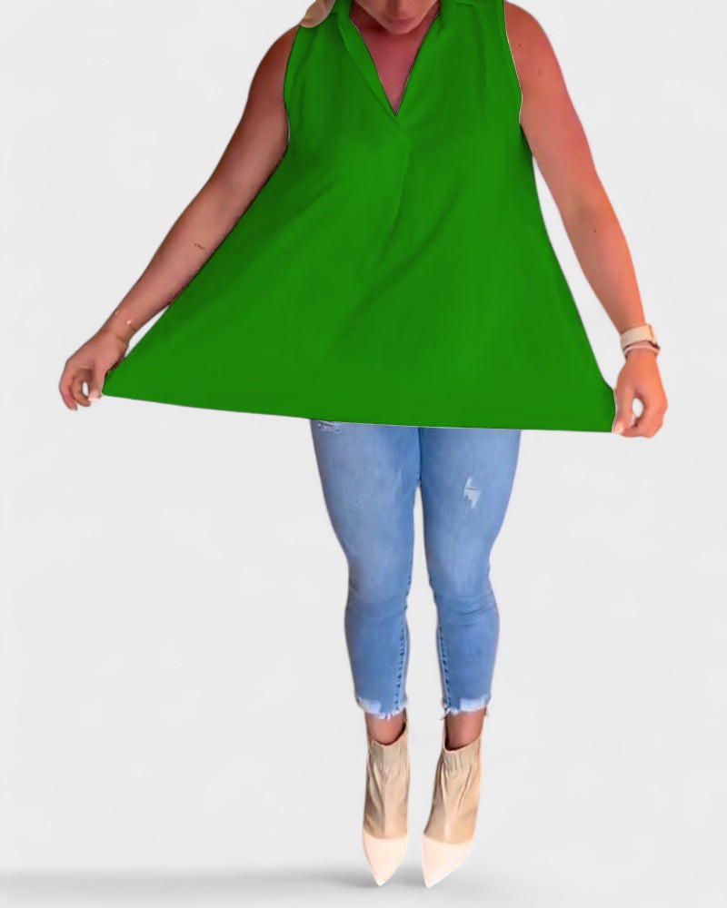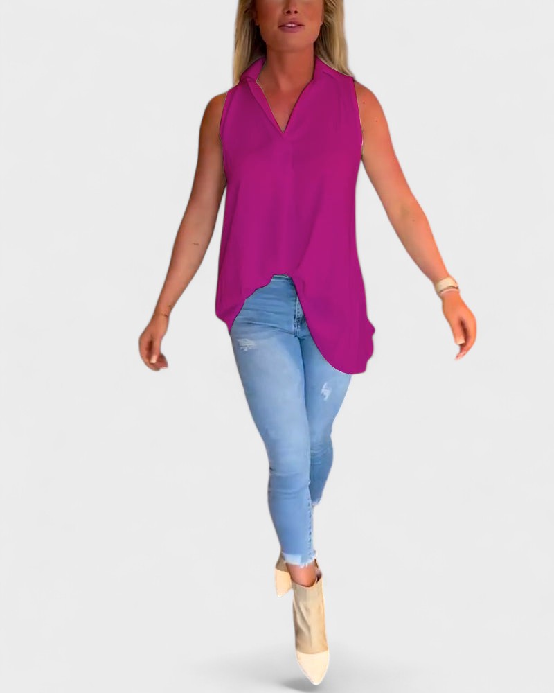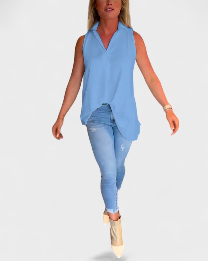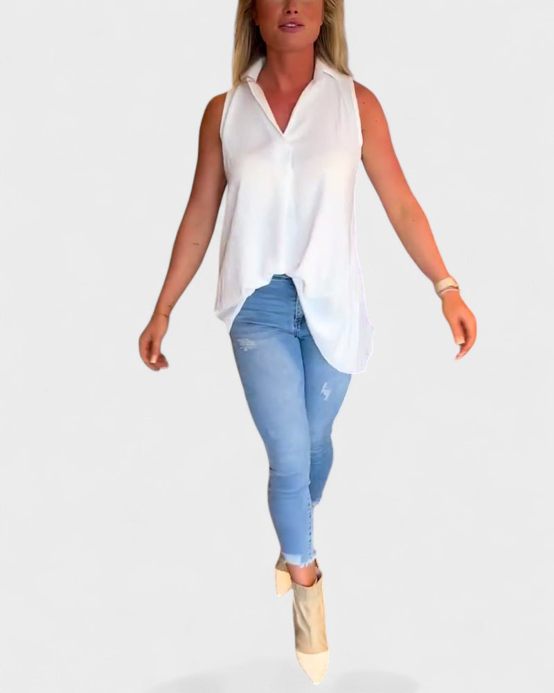 Experience the perfect blend of sophistication and comfort with this pure white sleeveless shirt. The flowing, asymmetrical cut offers a modern, versatile look that’s ideal for both the office and outdoor lunches. The V-neckline with collar adds a refined touch, while the lightweight fabric keeps you fresh all day long. Pair it with jeans, tailored trousers, or skirts – it transforms any look with simplicity and elegance.