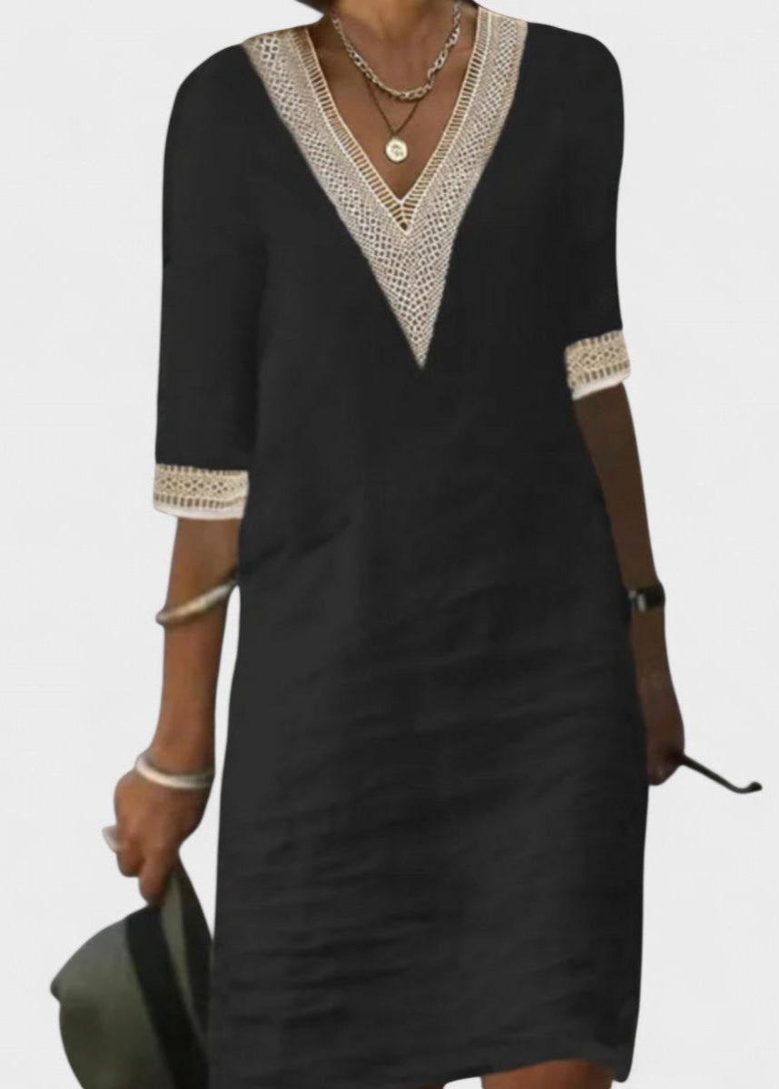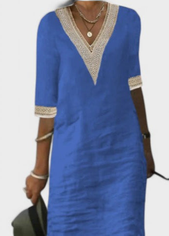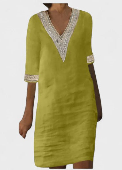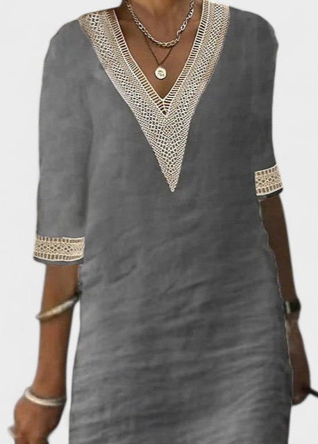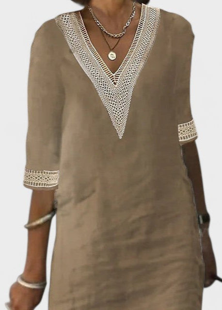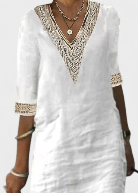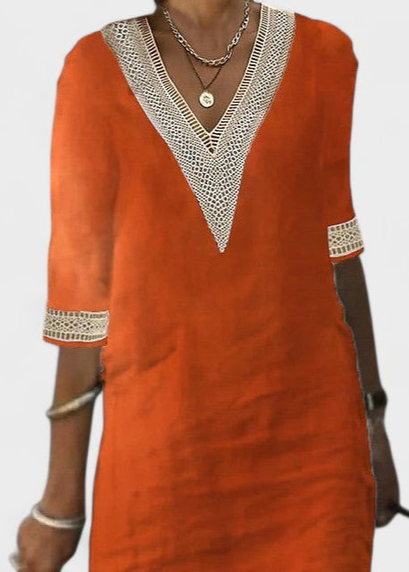 This mid-length dress is the perfect combination of comfort and authenticity. Featuring an elegant V-neck adorned with handmade embroidery and details at the wrists, the dress exudes sophistication with an ethnic and natural touch. The straight cut and flowing fabric make it an ideal choice for warm days or relaxed moments with plenty of style.